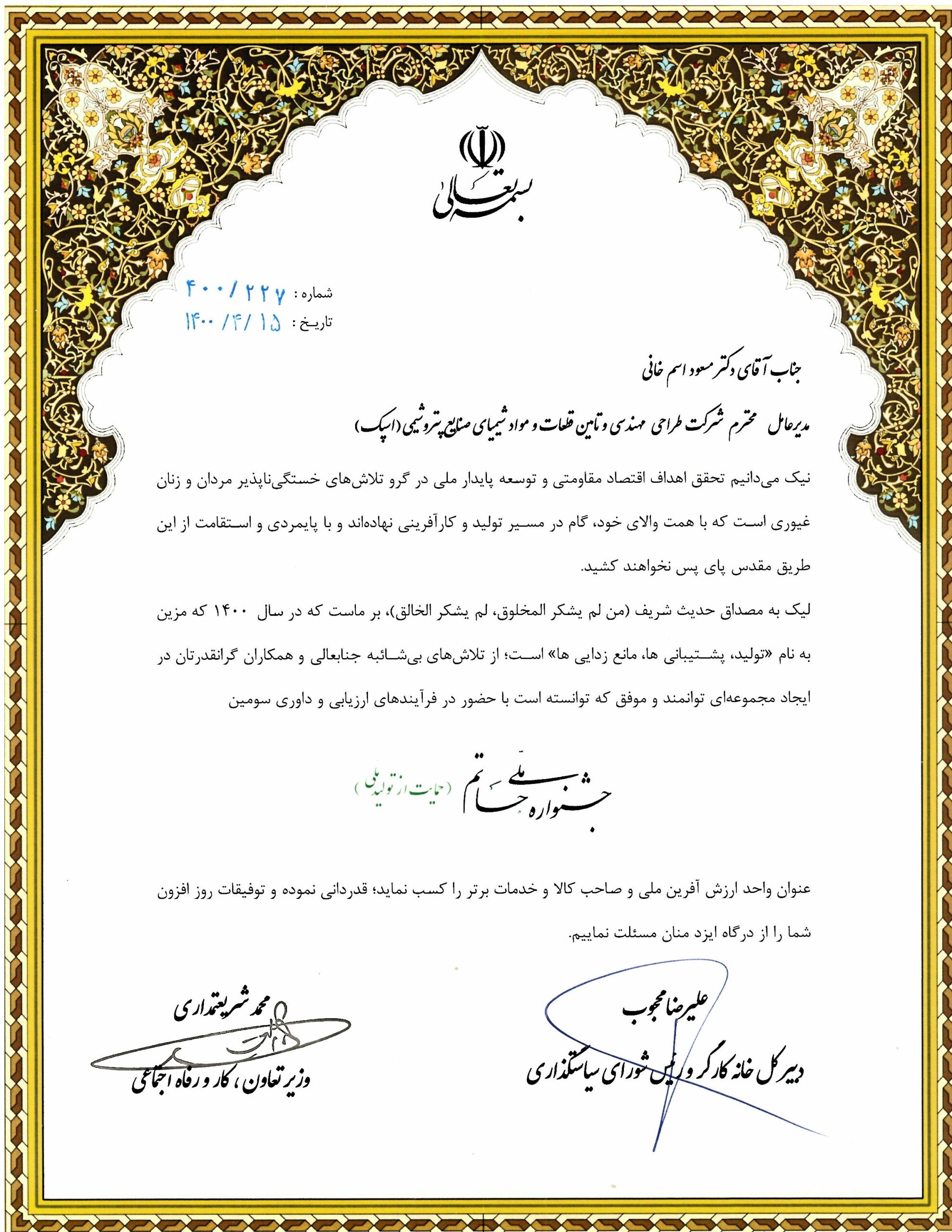 کسب نشان ملی حاتم توسط شرکت اسپک